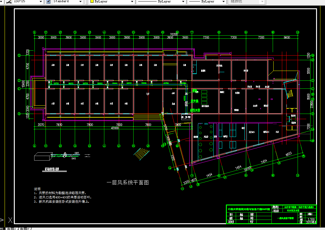 该设计详细介绍了系统方案的确定和该系统的冷负荷的计算、新风量的计算、设备的选型、风系统、水系统的水力计算。最后本设计还对相应的消声、减振作了简明的介绍。