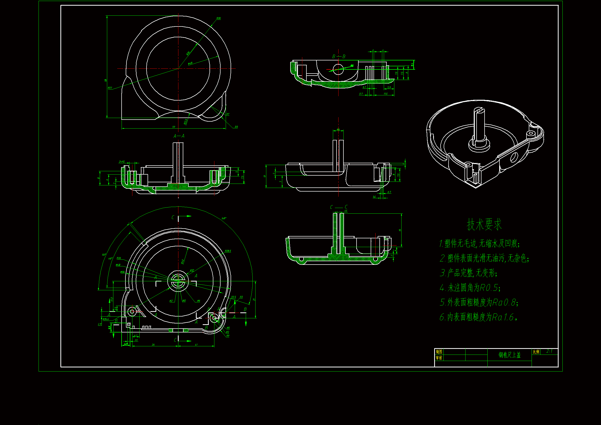 本设计是注塑模具设计为主题。其设计思路由参考多个生产事例而得出,设计内容是从零件的工艺分析开始的,根据工艺要求来确定设计的大体思路。在设计当中,很多东西都是自己原来所没有接触过的,尤其是前段时间所学的理论课知识与现在的自己动手操作设计,设计顺序开始是从零件的材料选择,接下是成型参数、密度、收缩率的确定,模具种类与模具设计的关系、塑件的尺寸精度与结构、注射机的选择、模具设计有关尺寸的计算(包括模具型腔型芯的计算及其公差的确定)、注塑机参数的校核、模具结构设计、模具冷却、加热系统计算、注射模标准件的选用及总装技术要求等内容。 其次是模具的结构,在模具结构的设计当中,首先设计的是模具的型腔结构,接下来是型芯结构、斜导柱、滑块、导向机构、复位杆、拉料杆、推件杆和推出机构,这样做的目的是为了规范化,更重要的是为了以后与制造人员的配合。既让自己有了良好的设计习惯,又能锻炼自己的配合意识。为以后工作做一次演练,这样更能体现理论与实践相结合的目的