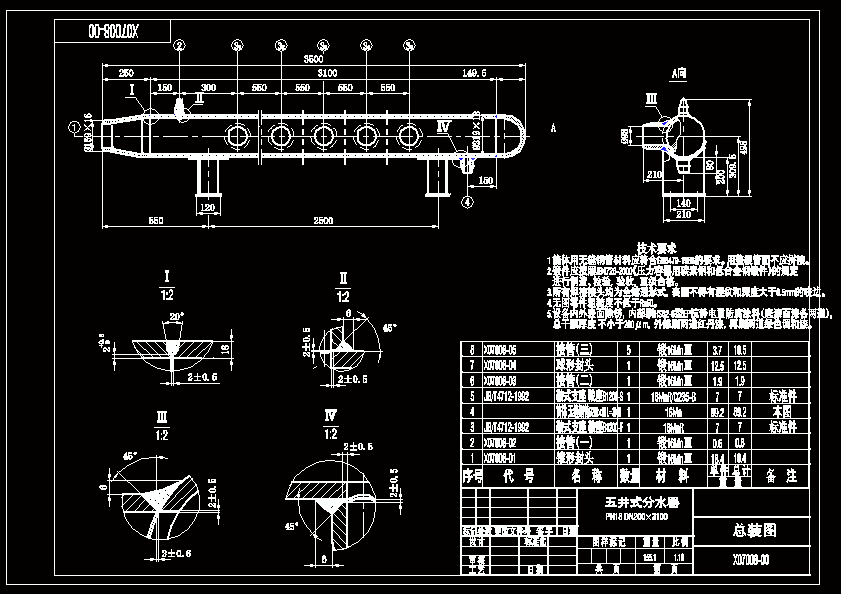 本设计分为焊接结构基础知识、焊接生产过程和焊接产品检验等三个部分,共九章设计内容。第一、二主要介绍分水器的相关知识,第三、四主要介绍分水器使用的材料及制作,第五、六、七主要介绍焊接生产前、中、后三过程知识,焊接材料、焊接工艺性审查,这部分内容是本产品设计课题重点,分水器是石油业油水分离的主要配套设备,用于井口在高压状态下的油水分离,分水器系承压设备,属压力容器,其承压能力,容量应与配套设备相对应。