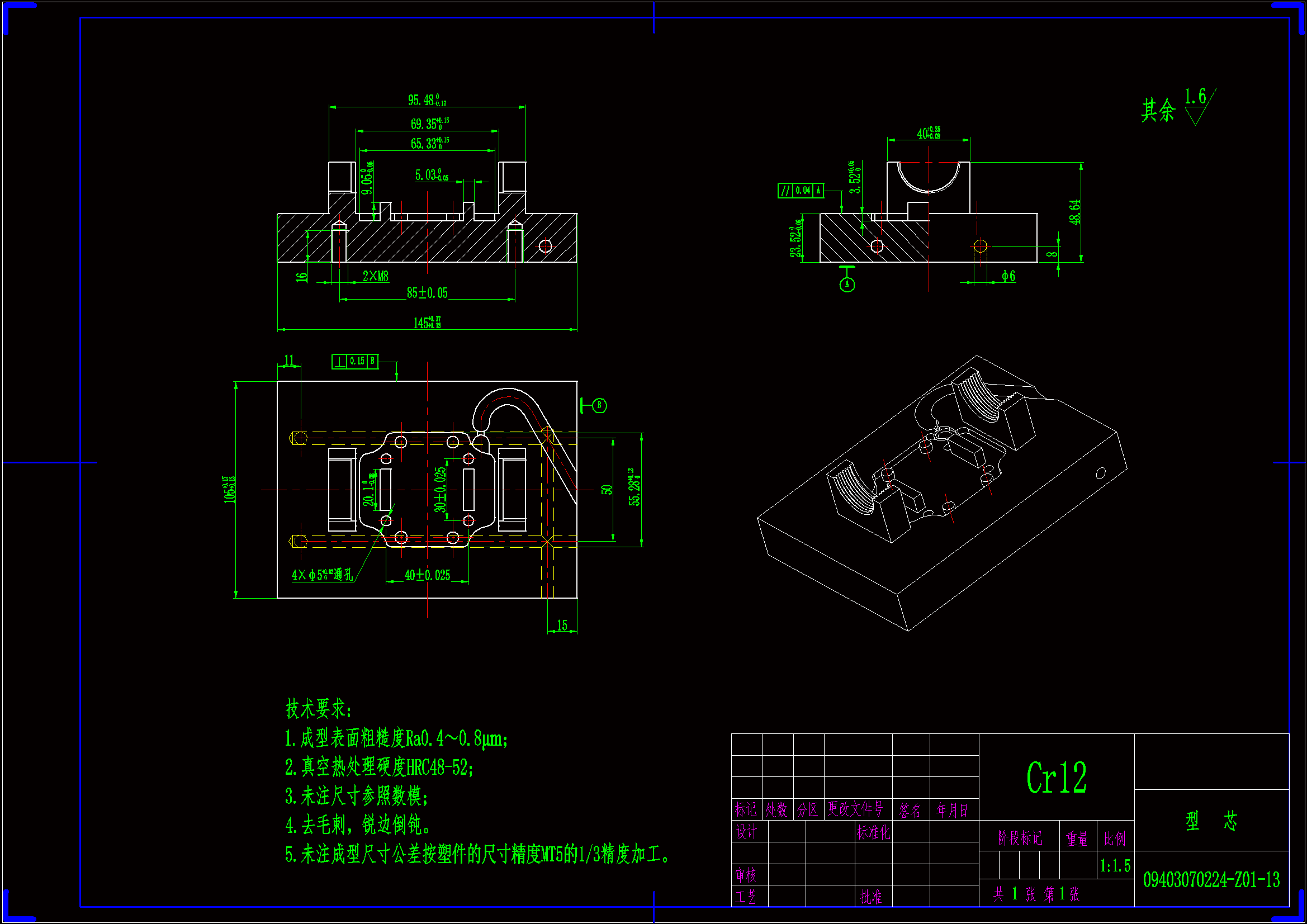 本文主要介绍了三向侧抽芯的固定式管架注塑模的结构设计,包括塑件工艺的分析,型腔排列的确定,分型面的确定,浇注系统、推出机构和冷却系统的设计,模架的选择,注塑机的选用,以及最重要的成型零部件的设计,侧向抽芯的设计等。根据塑件结构的复杂程度,同时考虑生产效率和批量的要求,采用一模两腔、侧浇口形式的单分型面注射模结构以及斜导柱侧抽机构。