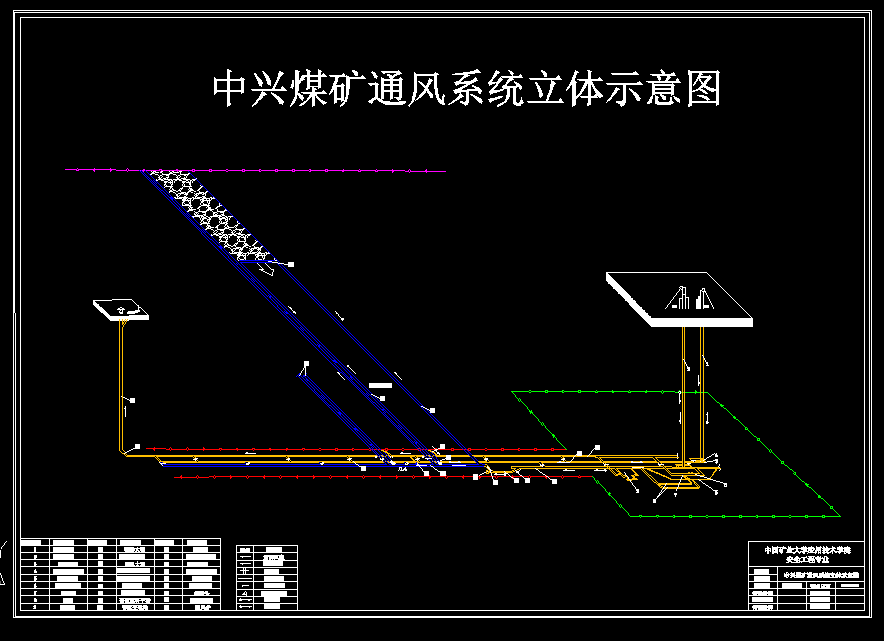 矿井为立井单水平开拓,主井、副井、风井各一个,采用中央边界式通风,主井、副井进风,风井回风。