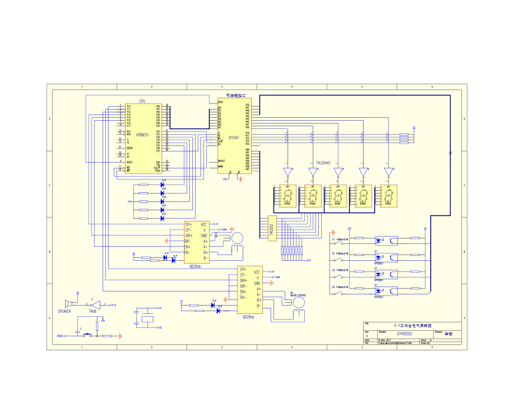 两轴数控工作台机电系统设计是一个开环控制系统,其结构简单,实现方便而且能够保证一定的精度,降低成本,是微机控制技术的最简单的应用。开环控制能充分的利用微机的软件、硬件功能以实现对机床的控制,使机床的加工范围扩大, 进一步提高机床的精度和可靠性。本文机械部分采用步进电动机通过齿轮减速器带动滚珠丝杠拖动工作台在直线滚动导轨副上运动,其中,步进电动机选用90BYG22602型号。工作台控制部分以AT89C51单片机为核心,作为主控器;利用8155H芯片实现与键盘/显示器的连接;选择步进电机配套驱动器BD28Nb 驱动步进电动机实现加、 减速、急停等操作,从而实现对工作台的控制。