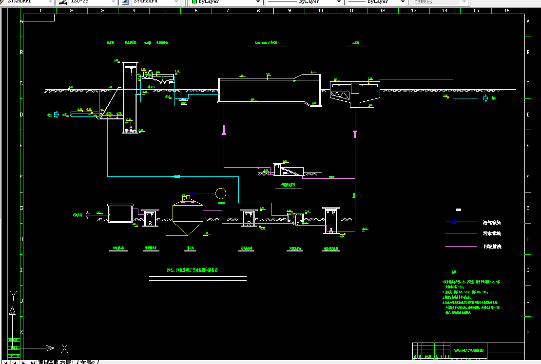 3、 完成设计图纸6张:污水处理厂工艺流程图, 污水处理厂总平面布置图,高程图;管线布置图,主要构筑物设计施工图;所有图纸按1#图出。