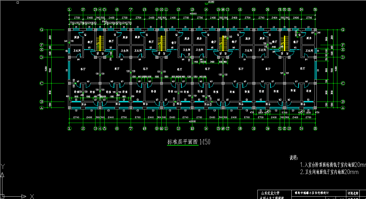 本次毕业设计题目为青岛市德馨小区住宅楼。总建筑面积约为3672 m2,采用框架承重结构,主体结构层数为五层,层高均为3.2m,抗震设防烈度为7度。