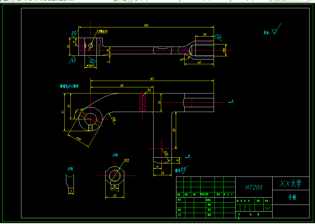 本文是对手柄(C1318自动车床手柄)零件加工应用及加工的工艺性分析,主要包括对零件图的分析、毛坯的选择、零件的装夹、工艺路线的制订、刀具的选择、切削用量的确定、加工工艺文件的填写。选择正确的加工方法,设计合理的加工工艺过程。此外还对手柄(C1318自动车床手柄)零件的两道工序的加工设计了专用夹具.