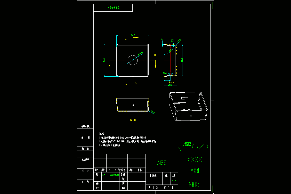 本次设计的为带孔内凸方形盖注塑模,为普通的塑料产品,运用模具相关知识,分析塑料产品工艺要求,尺寸精度要求,选取ABS材料,并且对本次模具的塑件分型面选取,型腔分布确定,计算产品的注射量数值,选用满足要求的注塑机,同时对注塑机的压力机锁模力等做出校核,且对成型零件设计,计算其工作尺寸等,并且通过制图软件绘制模具装配图零件图等,最终完成任务要求。