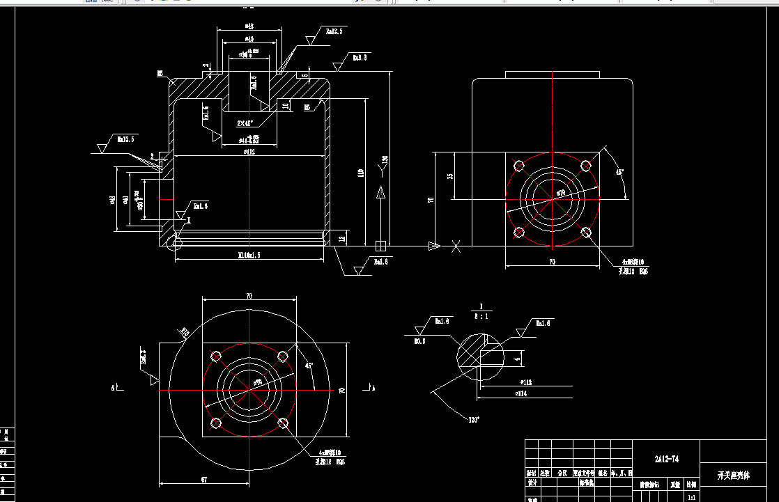 开关座壳体加工工艺规程及其铣顶部70 70端面的夹具设计,包括开关座壳体工艺分析、铣顶部70 70端面夹具设计及UG三维图,现对这三部分分述如下: