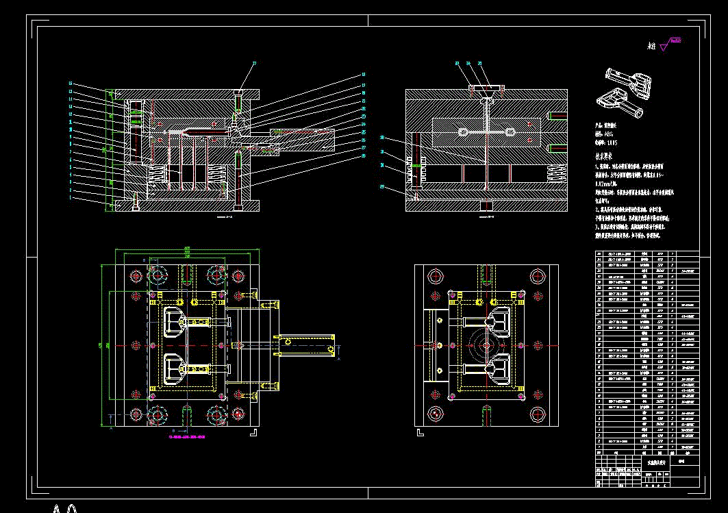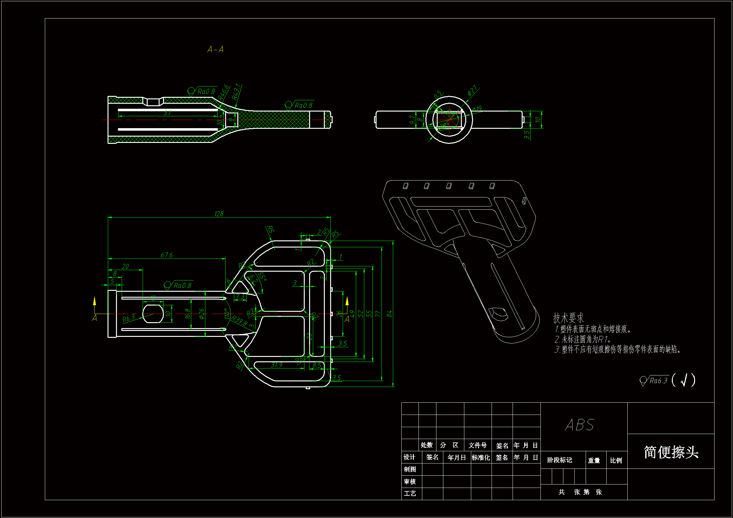 本次设计的题目是简便擦头注射成型模具设计,该塑件属于薄壁圆筒件,根据塑件的结构特点,采用塑件的底面为分型面和一模两腔模具结构,浇注系统选用侧浇口,并尽量缩短分流道长度,选择注塑机型号为HT160X2B。主型芯由定模型芯、动模型芯组成。采用浮动小型芯完成抽芯。刚性连接的推杆和脱模板推动塑件完成脱模。在动、定模型芯上开环形槽,设置密封圈,水道出口与进口在模具宽度方向,保证水流通畅且为湍流。