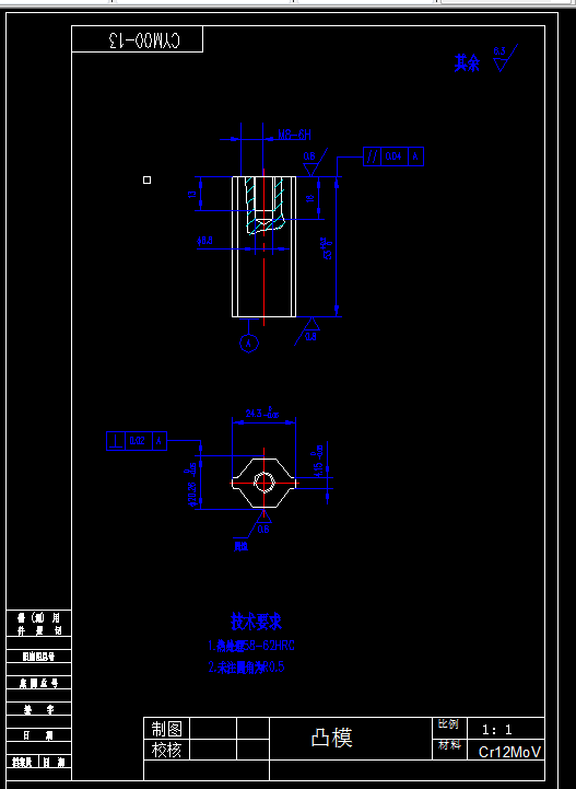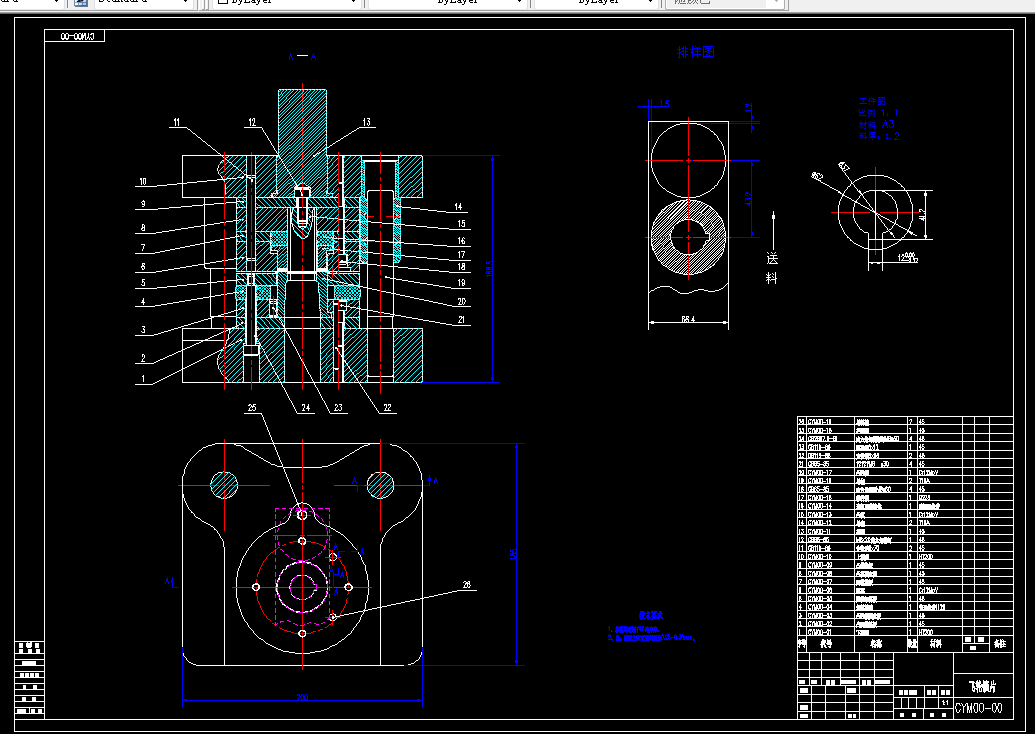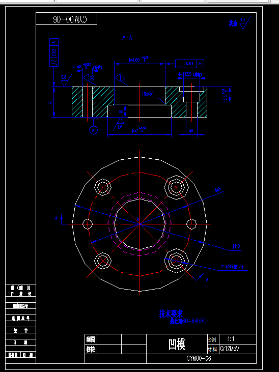 本此设计说明书论述了模具的下模由下模座、下模垫板、下模固定板、凹模镶块、抬料钉、导料板、卸料板,导柱导套、卸料板弹钉、卸料板限位器等零部件组成以及其设计计算过程。其中下模固定板、凹模镶块、导料板、卸料板拉深翻边凸模等是关键零部件。