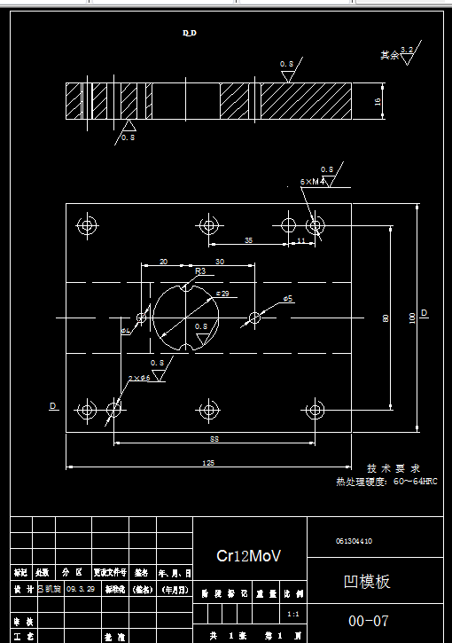 本设计运用了冲裁工艺及模具设计的基础知识。首先,分析了板材的性能要求,为选去模具的类型做了准备,同时,也为凸,凹模的材料有了依据。后分析冲裁件的特征,确定了模具设计参数,选择其他零件及卸料装置。也为凸,凹模尺寸的计算有了根据。还有零件的加工工艺。