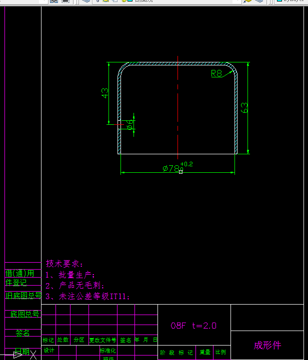 本次设计的为成型件冲压工艺与冲孔模设计,通过分析零件工艺要求着手,选取材料08F,零件的加工工序为冲孔,此种方式的加工方案有多种,经过对方案对比分析,选取冲孔模的方式。设计主要对排样进行对比确定,材料利用率的计算,搭边数值确定,以及凹模凸模的尺寸计算,冲裁力的计算,并且根据计算数值选取符合要求的压力机,以及对压力机做出参数校验,确保选取的压力机满足要求。最终通过使用CAD软件画出零件冲侧孔模具的总装图和零件图,完成设计要求。