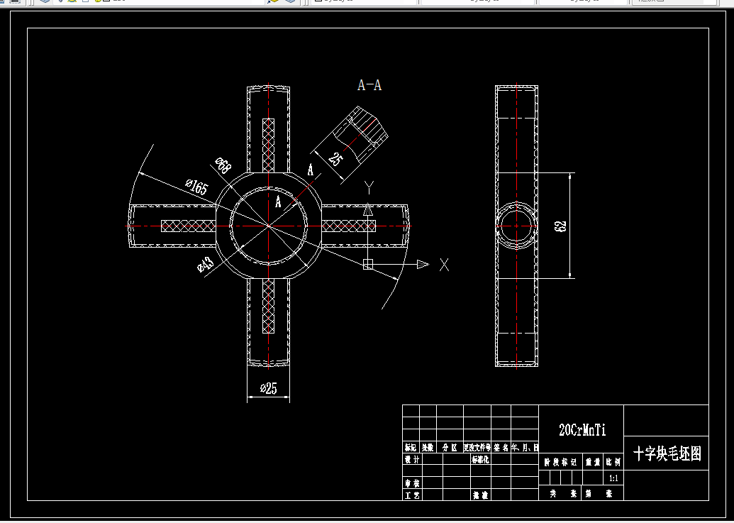 此次设计我分配的题目为:十字块零件机械加工工艺过程及精镗Φ46孔的夹具设计,年产量为20000台。十字块零件图与十字轴形状结构类似,我看了很久有些地方也没看明白,起初我以为这里是错误的,后来画出三维才算明白Φ126外圆及其在主视图上的宽度。从十字块的零件图结构可以看出,其很多位置均是车出来的,但我的题目为精镗Φ46孔,也就是Φ46孔的夹具需要设计专用夹具,用车床车孔四爪卡盘夹紧肯定是不行,故Φ46孔采用镗床加工,而其它加工位置均采用车床加工。