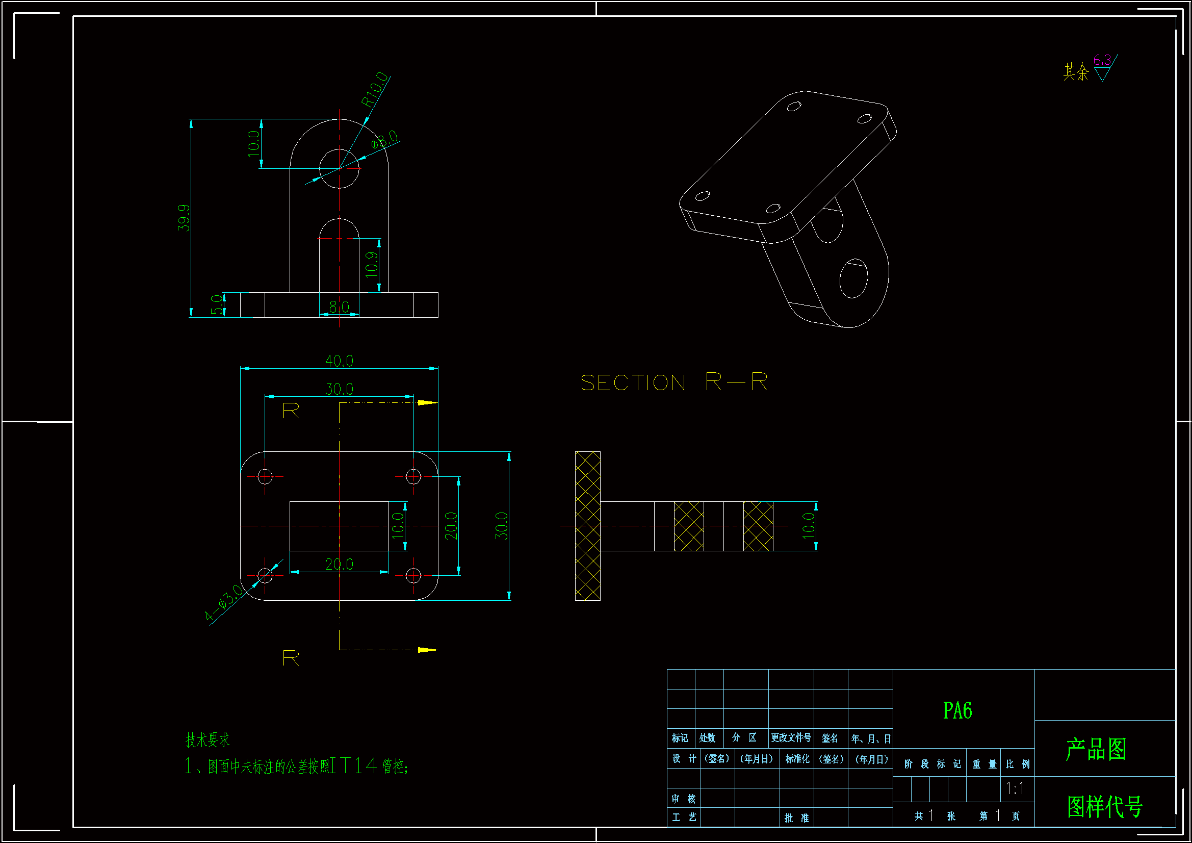 塑料是一种可塑性的合成高分子材料,具有重量轻且坚固,耐化学腐蚀, 电绝缘性好,价格便宜,可塑性好等特点,广泛应用于电脑、手机、汽车、电机、 电器、家电和通讯产品制造中。 注塑成形是成形塑件的主要方法之一, 是指使用注塑机将热塑性塑料熔体在 高压下注入到模具内经冷却固化获得产品的方法。注塑的优点是生产速度快,效 率高,操作可自动化,能成型形状复杂的零件,特别适合大量生产。 本次设计的产品为支座,具有重量轻,强度高,耐腐蚀,易清洁等 特点,为大批量生产产品。本次设计在针对产品进行工艺性分析后,确定模具分 型面、 型腔数目、 浇口形式、 位置大小; 其中最重要的是确定型芯和型腔的结构, 以及它们的定位和紧固方式。此外还进行了脱模机构的设计,合模导向机构的设 计,冷却系统的设计等。最后绘制完整的模具装配总图和主要的模具零件图及编 制成型零部件的制造加工工艺过程卡片。实践证明:该模具结构合理、可靠,并 能保证产品质量,对此类注塑产品的模具设计有参考价值。