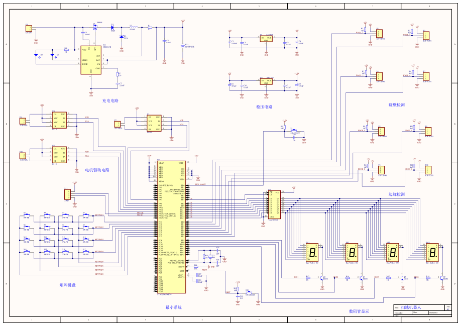 随着生活水平的提高,扫地机器人逐步进入普通家庭,扫地机器人具有主动躲避障碍物、自动吸尘、自动返回充电灯诸多智能功能,可帮助人们清扫家庭垃圾,给人们提供便利。本文设计的扫地机器人采用机电一体化的设计思想对机械结构和控制系统进行设计,机械设计主要完成了整机外型的选定,及清扫机构的设计,其中清扫机构主要采用蜗轮蜗杆带动轴转动的方式实现清扫功能。控制系统才用了STM32F407VET6单片机作为控制系统的核心,主要完成了驱动电机和清扫电机的控制,设计了由八个红外传感组成的检测系统,主要进行边缘检测和碰壁检测,并且采用了数码管显示模块与单片机连接实现对清扫时间的显示,整体控制简单,使用方便。此扫地机器人的机械结构实现了给定的设计参数要求,控制形态也满足了设计要求。