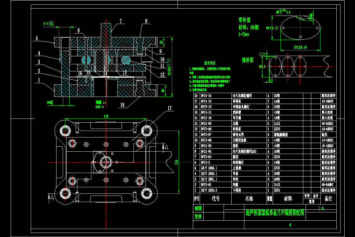 关键词:超声换能器弧形盖片,冲裁模,冲孔落料,级进模