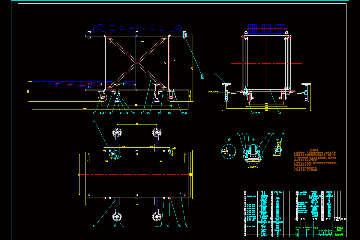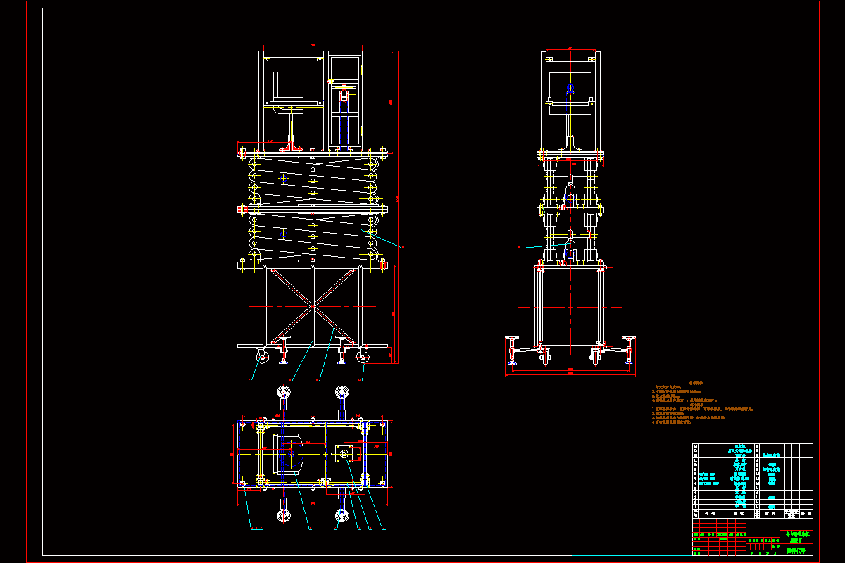 在设计中,先确定了基本结构,再通过设计计算或借鉴经验得出各部件的设计尺寸;而后据设计尺寸及载荷对轴承和脚轮进行了选型;还简单地计算了螺旋副的基本尺寸。