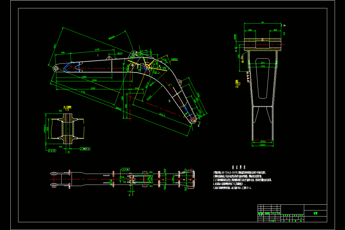 本主要对由动臂、斗杆、铲斗、销轴组成挖掘机工作装置进行设计。具体内容包括以下五部分: