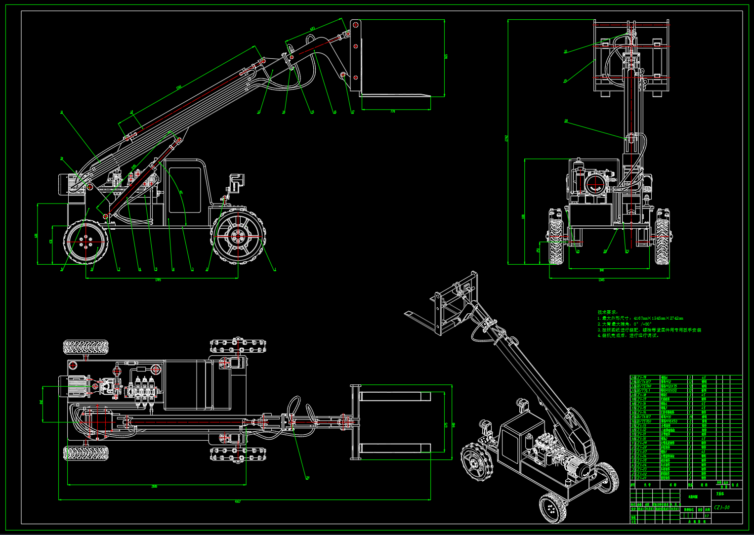本次设计的是一种叉装机整机结构及其液压系统的设计,伸缩臂叉装机是一种多用途起重搬运设备,集稳定性和高工效于一身,适合于多种物料搬运环境。本机结构紧凑,操纵灵活,举升灵敏,自动调平、净载重负荷指标高、叉运精准。包含零部件及装的SW2018三维设计,液压系统原理图设计,管路图设计,整机二维装配图设计等