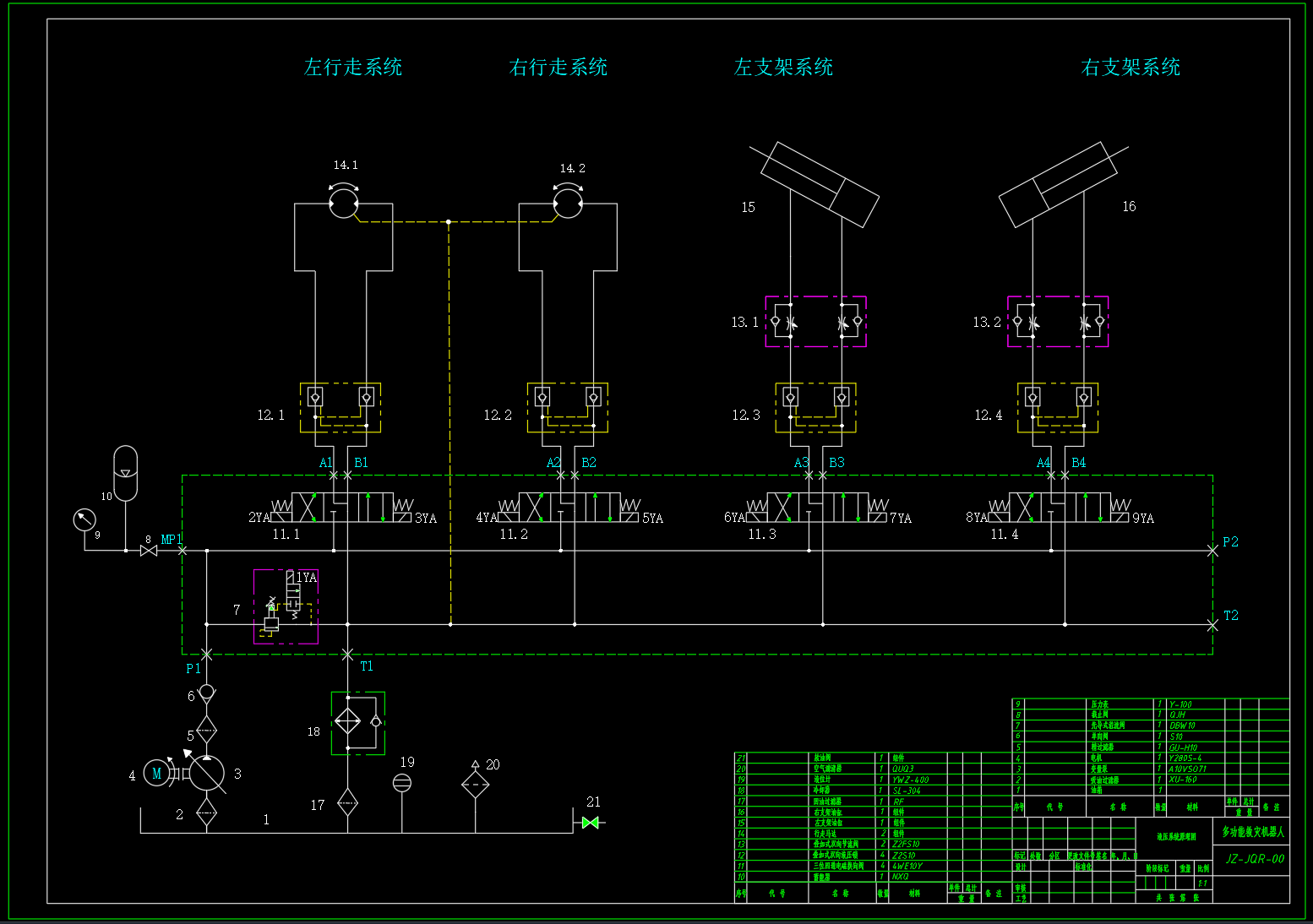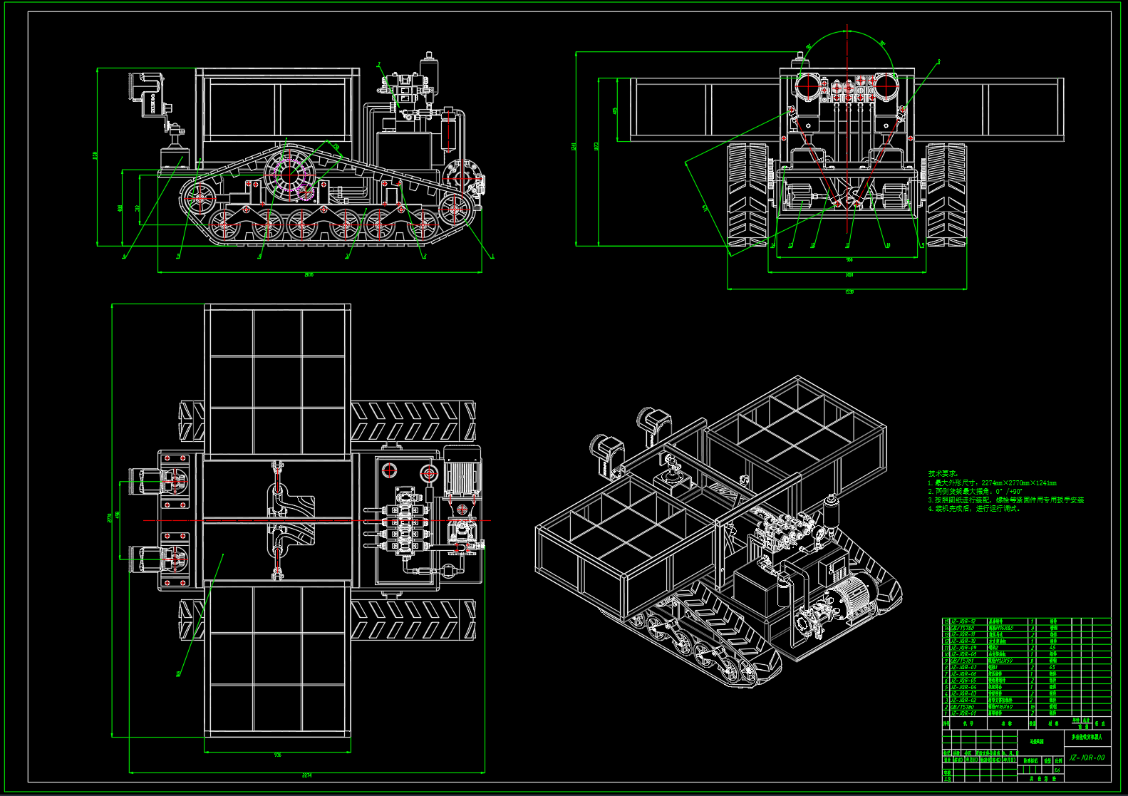 本设计为一种多功能救灾机器人总计结构及液压系统设计,这种机器人可以实现输送必需品,救援搜集,信息反馈等。主要包括整机三维SW2018设计,液压系统原理图设计,整机二维装配图设计,液压管路图设计,受力分析,参数计算,液压系统参数计算等。