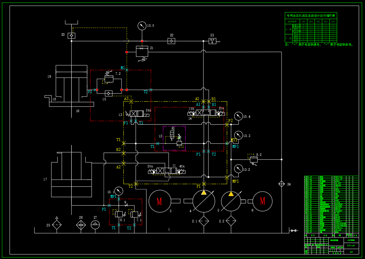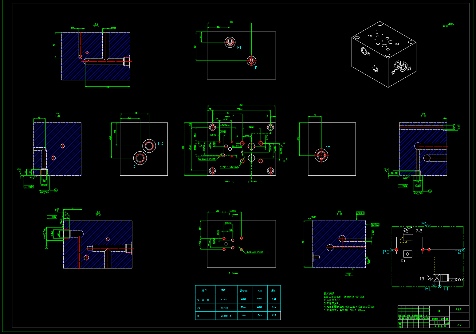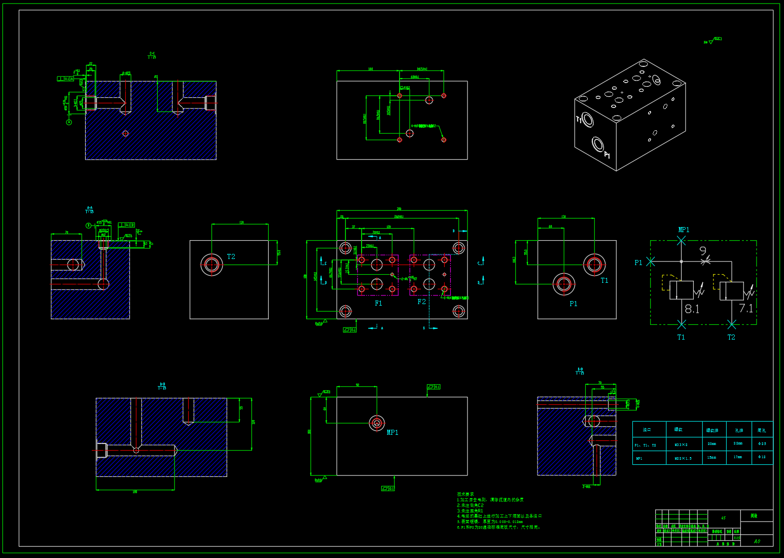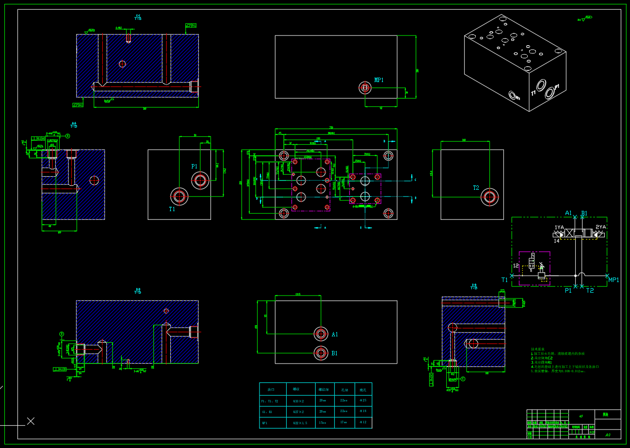 200T液压机液压系统设计,包括了液压系统原理图设计,液压集成阀组1/2/3/4设计,液压阀块1/2/3/4设计,液压系统的设计计算与分析,循环动作:主油缸:快速下行—慢速加压—保压—泄压回程—停止的循环动作;顶出缸:顶出—退回,或者是浮动压边—停止—顶出的动作循环。