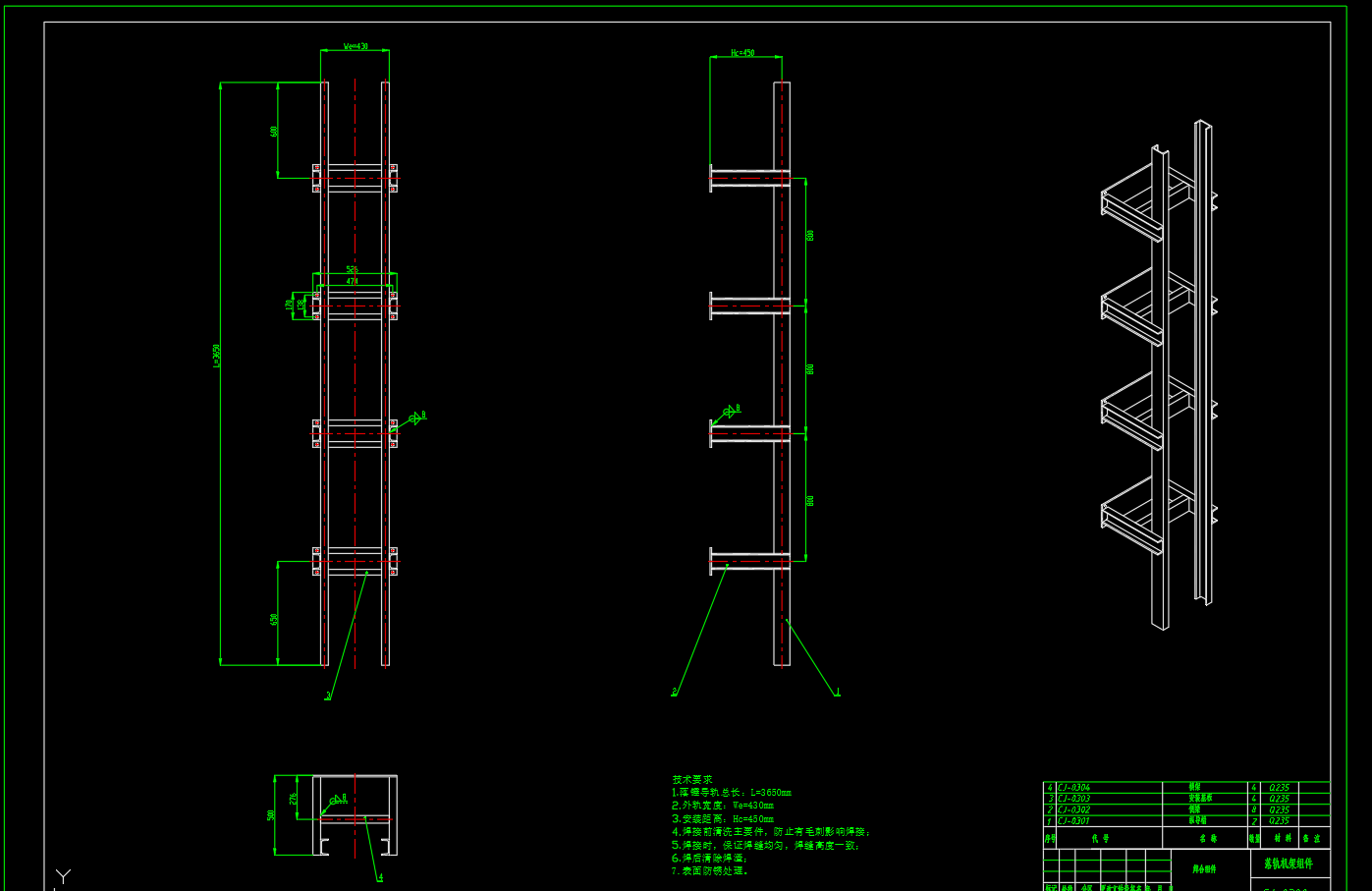 包含全部三维SW2016零部件以及装配,二维CAD(总装配图,冲击锤组件,落轨机架焊合组件)CJ001型落锤试验机是一种适用于金属材料反结构抗冲击性能测试的仪器,立式导轨架设计采用了主支架与辅助支架相结合的结构,保证了具有良好的稳定性和强度,所有支脚均采用了调节螺钉,从而方便地调节支架的垂直度。此外,整体结构均采用10号槽钢,用手工电弧焊接进行连接,使得整体性能更加可靠。基本参数:落锤导轨总长L=3650mm;外轨宽度We=430mm;落锤自重m1=260kg,安装距离Hc=450mm;