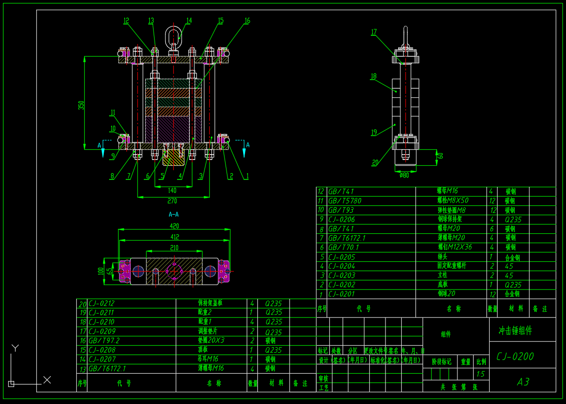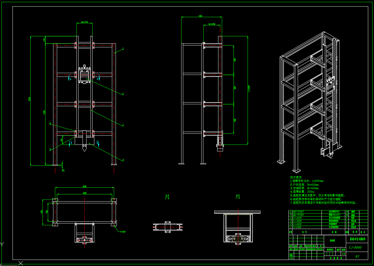 包含全部三维SW2016零部件以及装配,二维CAD(总装配图,冲击锤组件,落轨机架焊合组件)CJ001型落锤试验机是一种适用于金属材料反结构抗冲击性能测试的仪器,立式导轨架设计采用了主支架与辅助支架相结合的结构,保证了具有良好的稳定性和强度,所有支脚均采用了调节螺钉,从而方便地调节支架的垂直度。此外,整体结构均采用10号槽钢,用手工电弧焊接进行连接,使得整体性能更加可靠。基本参数:落锤导轨总长L=2950mm;外轨宽度We=430mm;落锤自重m1=330kg,安装距离Hc=450mm;