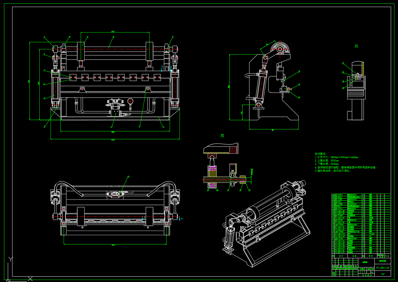 整个液压折弯机液压系统由一个变量泵提供动力油源,由1个主系统构成,2升降油缸作为执行元件执行动作。液压驱动两侧油缸经过偏心轮机构实现上模下压,完成折弯动作。基本参数:合模压力:220KN,上模长度:2000mm,下模长度:2000mm 外形尺寸:2360mmx900mmx1422mm,整机重量:0.8T。