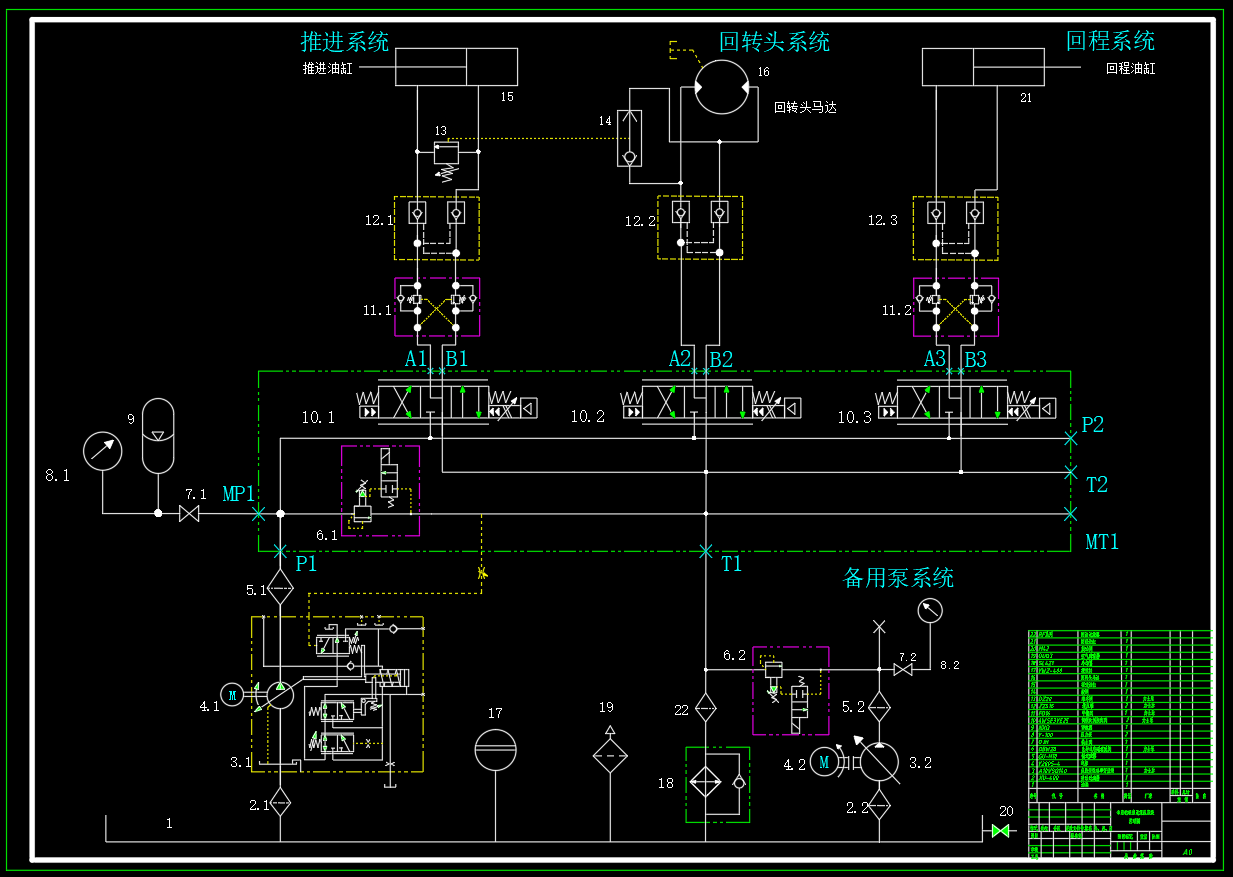 整个钻机推进液压系统由一个变量泵提供动力油源,由三个子系统组成整个液压系统。包括推进系统、回转系统和回程系统。同时因为大流量设备,设置一套备用泵系统,用于在高压大流量时辅助主泵进行工作。具体参数:钻机推进系统控制钻机的推进和收回,推进精度 5cm,钻头尺寸42mm,钻孔深度 1-1.2m。钻头每前进10cm后退前进各两次,将孔中残留碎屑排出孔外,避免卡钻等