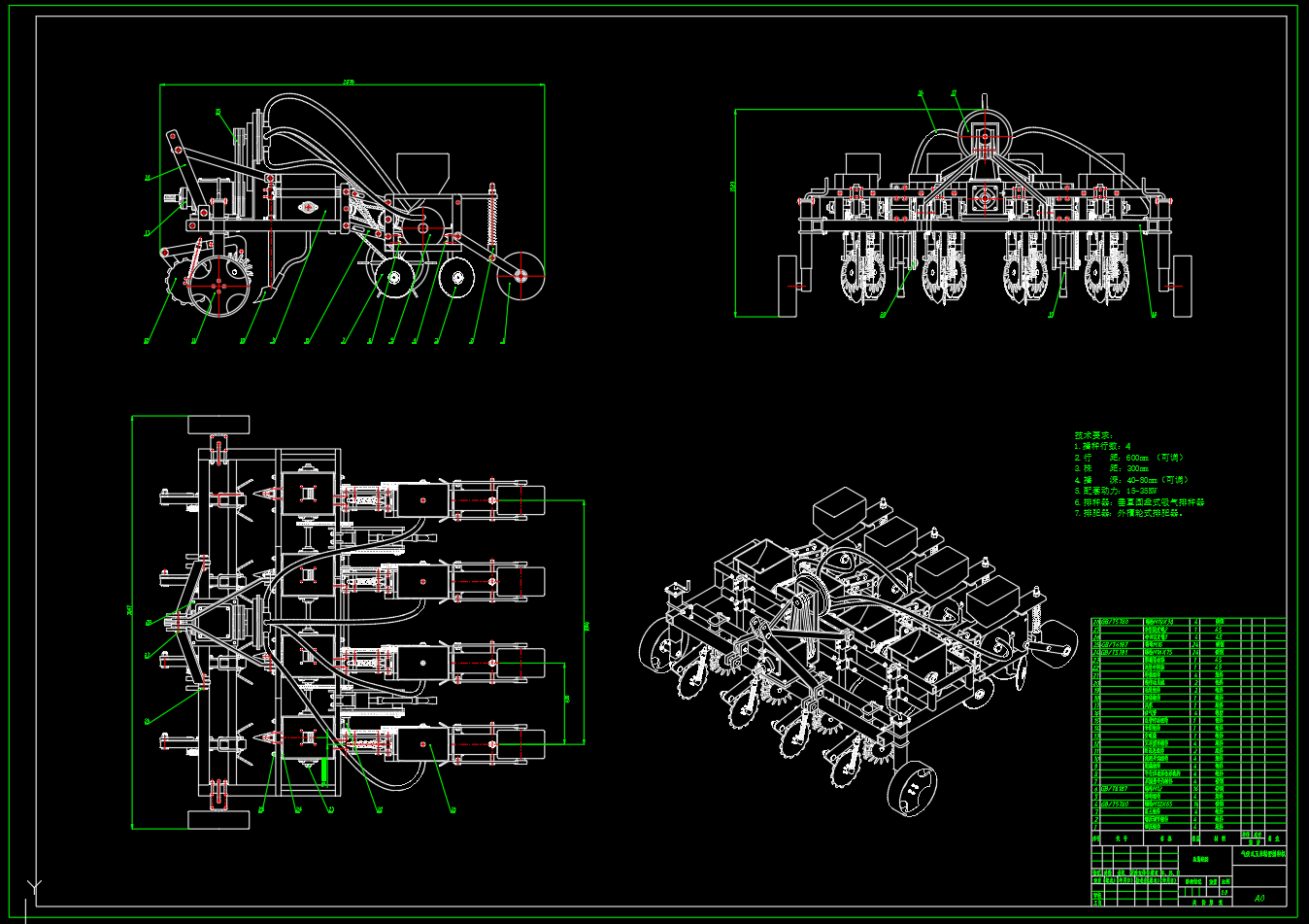 包含二维CAD(装配图,地轮组件,仿形机构,机架组件,开沟施肥铲组件,灭茬拨草组件,排肥箱,排种器,排种轴,破茬刀,开沟器,镇压轮,传动系统图),包含三维SW2018全部零部件以及装配。参数:行距:60cm ,株距:30cm,播种行数:4行,播种深度:4-8cm,配套动力:15-35kw,机组速度:4-6km/h,排种器:垂直圆盘式气吸排种器, 排肥器:外槽轮式排肥器。