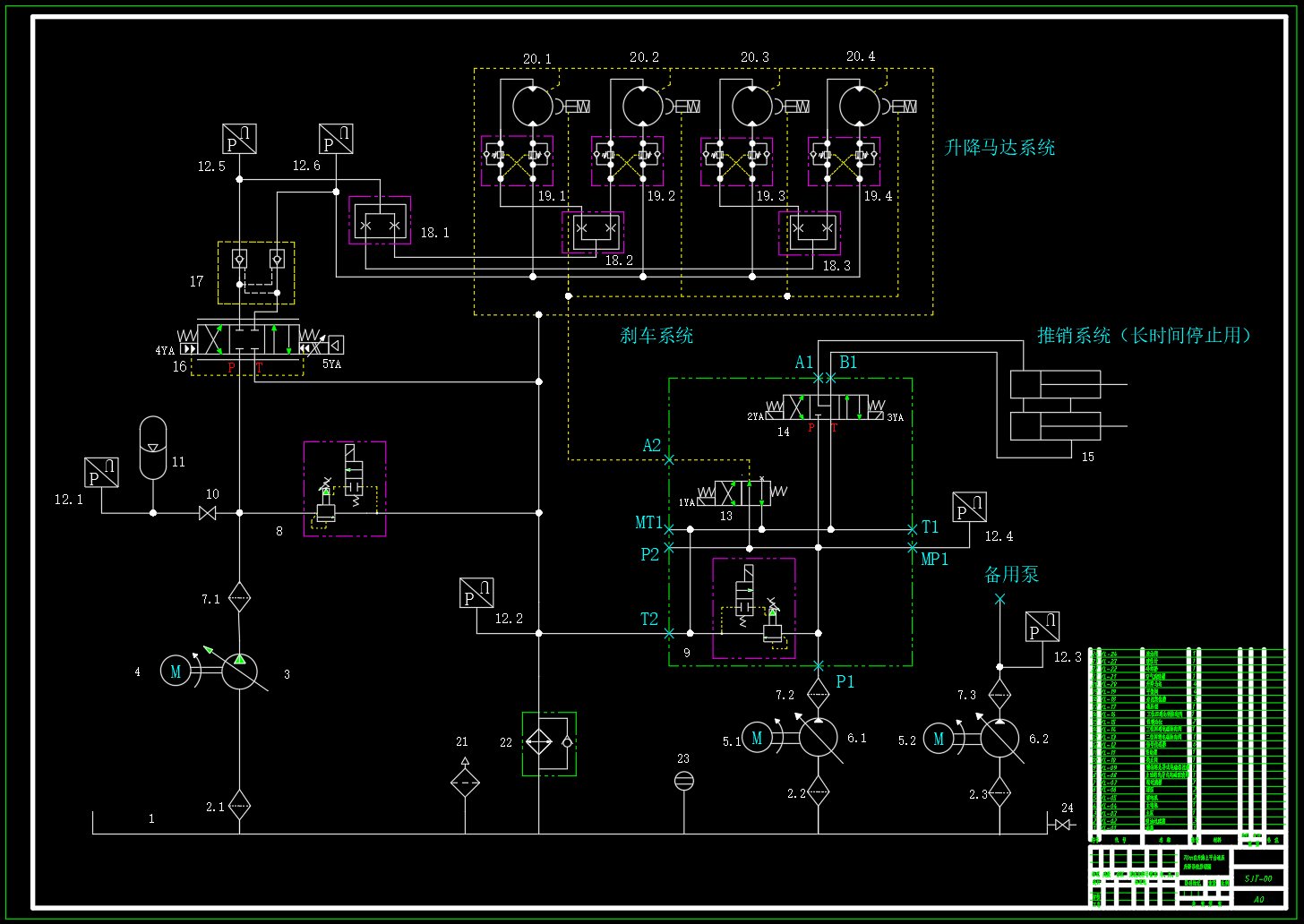 包含二维CAD(液压系统原理图,泵站装配图,阀块零件图,油箱图,集成块装配图),包含全部三维SW2018所有零部件以及装配,包含设计文档。技术参数:作业水深:70m;举升力:14000kN;最大升降速度:0.6m/min;平台预压力/腿:19600kN。整个升降平台回路由两个液压泵提供动力油源,一个备用液压泵;其中两个动力油源泵分别为:一、升降马达系统的主油路的主泵;二、刹车系统和推销系统的控制系统油路的辅泵;还有一个备用泵。