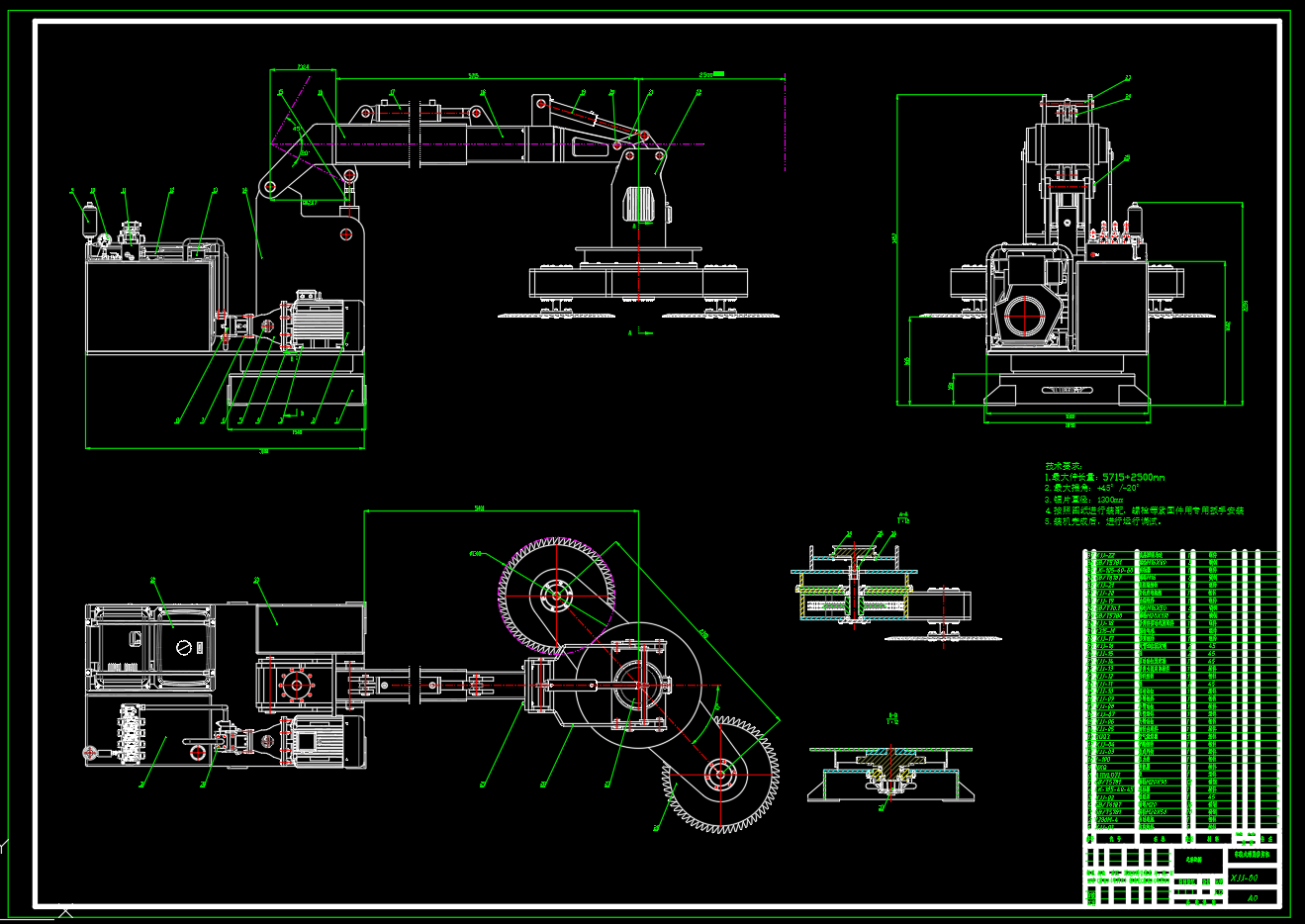 包含二维CAD(修剪机总装配,大臂油缸,缸筒,活塞,缸杆,导向套,压盖,修剪组件,液压系统原理图,大臂组件,锯片,锯片回转轴,轴承端盖),包含整机SW2018三维所有零部件及装配,包含设计文档。本文设计主要对车载绿篱修剪机整机结构及其液压系统进行设计,使整个机构能满足各种工况条件下的绿篱的修剪工作,可以完成水平修剪、垂直修剪,避桩修剪、绕桩修剪、长边坡修剪等工作的轻便简单的车载式绿篱修剪机,同时液压系更加方便现实功能,整个系统更加稳定平顺,实现机械化,智能化,大大提高作业质量和工作效率,大大降低劳动强度。基本参数:最大工作伸长量:5175±2500mm,最大摆角:+45°/-20°,锯片直径:1300mm,修剪机构与整机角度:47°,修剪锯片数量:2,两修剪锯片中心距:2700mm,修剪幅度:4000mm,修剪前进速度为:8km/h,修剪刀片转速为3000r/min,旋转台的转速为n=40r/min。