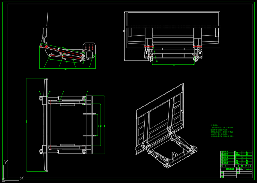 包含二维CAD(二维装配图,固定支架焊合图,油缸装配,缸筒焊合,左端盖,导向套,缸杆,活塞和液压系统原理图),包含三维SW2018所有零部件以及装配,随着市场政策法规的完善与运输业需求精细化,汽车液压尾板逐渐成为研究热点。机械性能稳定、承载能力强、收放灵活是商用车液压尾板的基本设计要求,除此之外,随着车辆轻量化要求不断提高,设计结构紧凑、抗冲击、耐用性强的液压尾板是当务之急。 本文设计的是一种商用车液压尾板装置,主要开展以下几项设计:一是通过对液压尾板装置基本原理分析、结构分析以及承载力分析后确定液压尾板装置的基本结构组成;二是根据液压尾板装置的承载力以及受力分析得出支架油缸和尾板油缸所受到的最大力,计算出油缸的基本参数,进而确定油缸的基本结构形式以及油缸的基本尺寸,并对油缸结构形式以及主要零件的工艺进行简单分析;三是对整个液压尾板装置的液压控制系统进行设计分析以及参数计算、元件选型等工作。通过对以上基本内容展开设计后,最终确定了液压尾板装置的基本结构、基本组成、控制油缸结构参数、液压控制系统参数以及元件选型使用。主要参数:面板规格:1800mm×2200mm; 提升重量:1T(重物置于尾板伸平时,尾板的近似重心位置承重);自 重:0.3T (整个尾板总成的重量);架体回转臂长:825mm。
