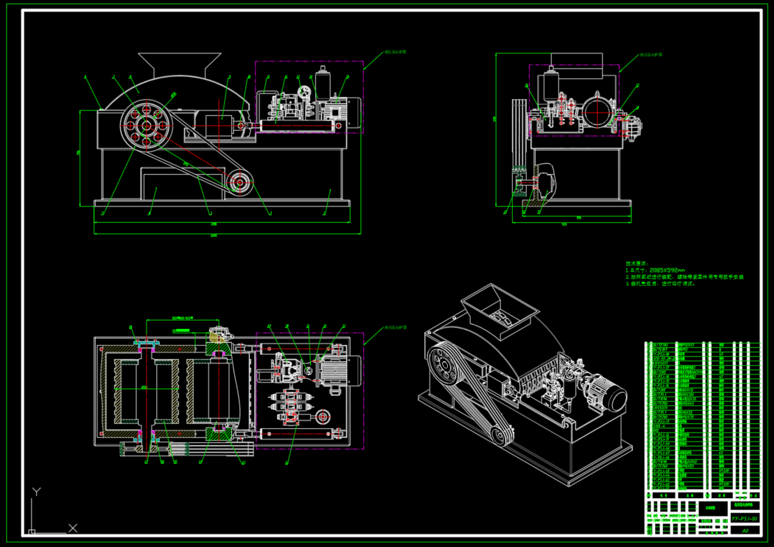 包含二维CAD(破碎机装配图,入料组件图,主辊筒焊合图,液压系统原理图,油缸装配图,油缸左端盖,导向套),包含整机SW2018三维零部件以及装配,包含设计文档。液压辊式破碎机是一种大中型破碎设备。适用于将各种物料通过双辊挤压旋转破碎成所需颗粒度的一种设备。本文设计的为双辊破碎机,是利用一对相向转动的圆辊破碎物料。物料经设备上部加料口落入两辊子之间,依靠摩擦力的作用被带入两辊子之间的间隙而逐渐被压碎,成品物料自下部漏出。遇有过硬而不能破碎的物料时,辊子自动退让,使辊子间间隙增大,过硬物料落下,凭借液压缸的作用,辊子恢复到原间隙,从而保护机器,调整两个辊子间的间隙,即可控制产品最大粒度。基本参数为:生产能力:22t/h,破碎形式:双辊旋转挤压,辊子直径:500mm,辊子转速:47r/min,物料粒度:0-50mm。