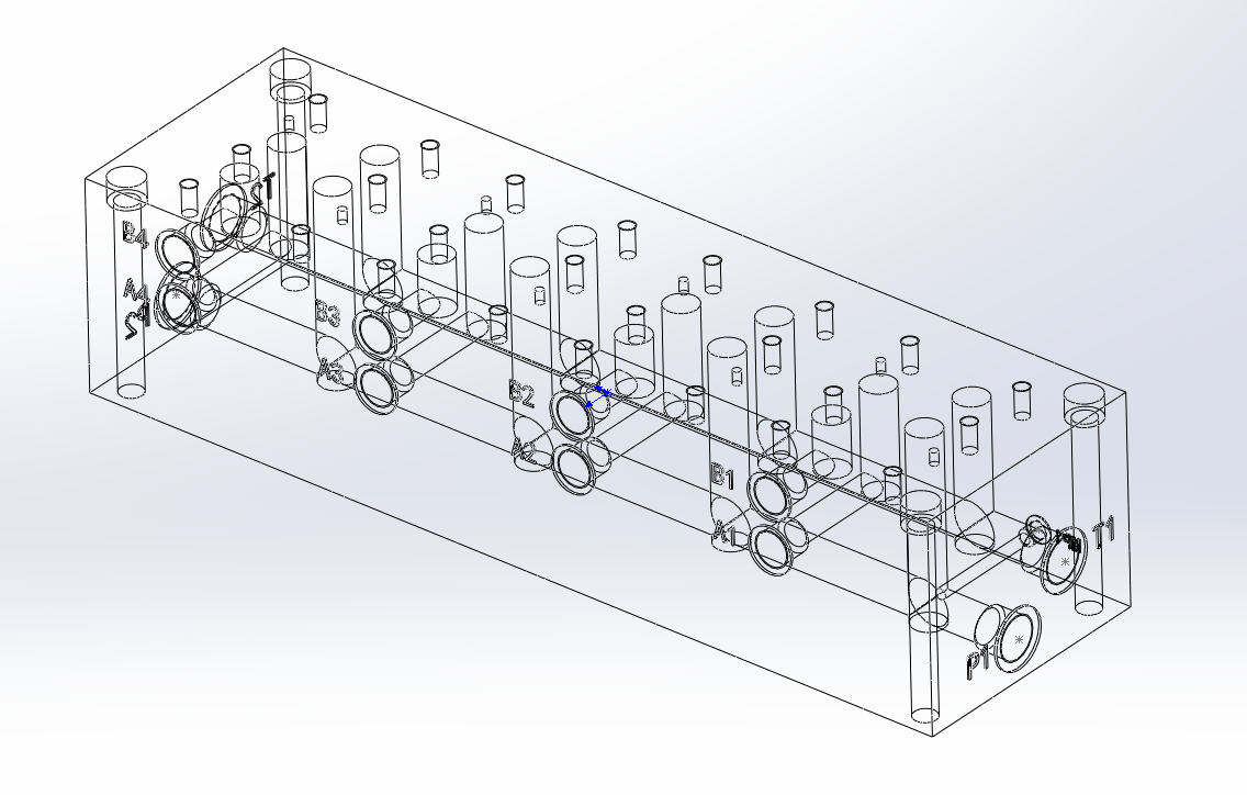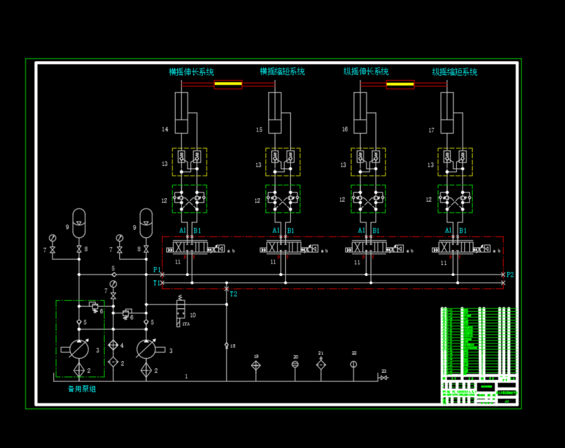 包含二维CAD(液压系统原理图,阀块零件图),包含SW2016三维(集成块装配图和阀块三维零件),包含设计word文档。整个系统有两组相同的泵组提供油源,其中一组备用,横摇伸长系统和横摇缩短系统相互配合;纵摇伸长系统和纵摇缩短系统相互配合。基本参数:系统工作压力:25MPa,系统最高压力:31.5MPa,系统工作流量:200L/min,油缸驱动力:2320000N。