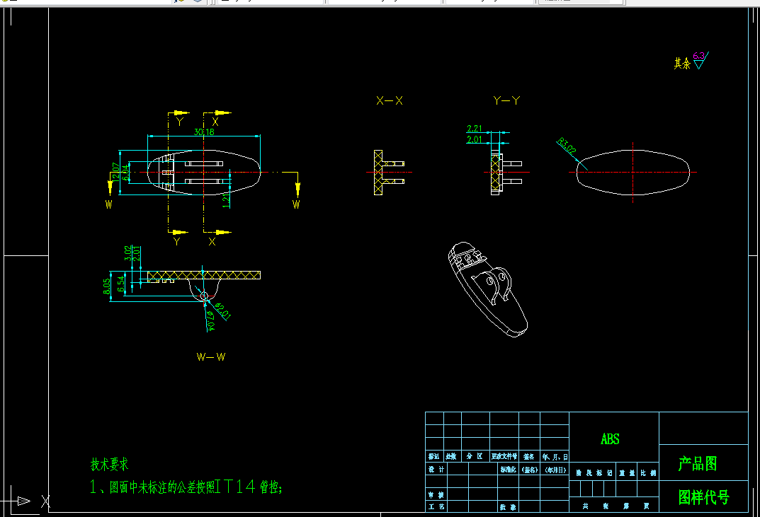 塑料是一种可塑性的合成高分子材料,具有重量轻且坚固,耐化学腐蚀, 电绝缘性好,价格便宜,可塑性好等特点,广泛应用于电脑、手机、汽车、电机、 电器、家电和通讯产品制造中。 注塑成形是成形塑件的主要方法之一, 是指使用注塑机将热塑性塑料熔体在 高压下注入到模具内经冷却固化获得产品的方法。注塑的优点是生产速度快,效 率高,操作可自动化,能成型形状复杂的零件,特别适合大量生产。 本次设计的产品为耳机夹子,具有重量轻,强度高,耐腐蚀,易清洁等 特点,为大批量生产产品。本次设计在针对产品进行工艺性分析后,确定模具分 型面、 型腔数目、 浇口形式、 位置大小; 其中最重要的是确定型芯和型腔的结构, 以及它们的定位和紧固方式。此外还进行了脱模机构的设计,合模导向机构的设 计,冷却系统的设计等。最后绘制完整的模具装配总图和主要的模具零件图及编 制成型零部件的制造加工工艺过程卡片。实践证明:该模具结构合理、可靠,并 能保证产品质量,对此类注塑产品的模具设计有参考价值。