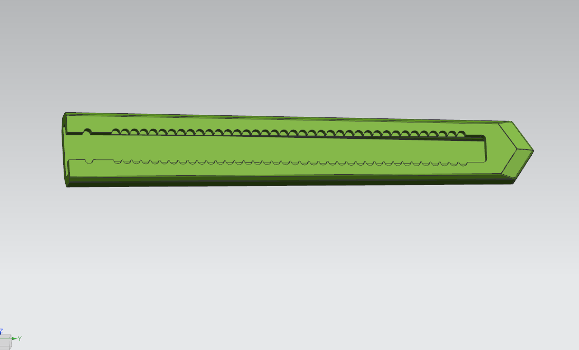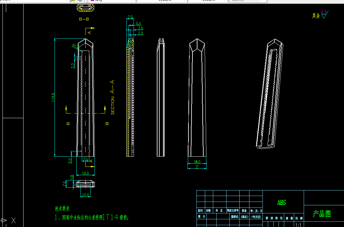 塑料是一种可塑性的合成高分子材料,具有重量轻且坚固,耐化学腐蚀, 电绝缘性好,价格便宜,可塑性好等特点,广泛应用于电脑、手机、汽车、电机、 电器、家电和通讯产品制造中。 注射成形是成形塑件的主要方法之一, 是指使用注射机将热塑性塑料熔体在 高压下注入到模具内经冷却固化获得产品的方法。注射的优点是生产速度快,效 率高,操作可自动化,能成型形状复杂的零件,特别适合大量生产。 本次设计的产品为美工刀把手,具有重量轻,强度高,耐腐蚀,易清洁等 特点,为大批量生产产品。本次设计在针对产品进行工艺性分析后,确定模具分 型面、 型腔数目、 浇口形式、 位置大小; 其中最重要的是确定型芯和型腔的结构, 以及它们的定位和紧固方式。此外还进行了脱模机构的设计,合模导向机构的设 计,冷却系统的设计等。最后绘制完整的模具装配总图和主要的模具零件图及编 制成型零部件的制造加工工艺过程卡片。实践证明:该模具结构合理、可靠,并 能保证产品质量,对此类注射产品的模具设计有参考价值。