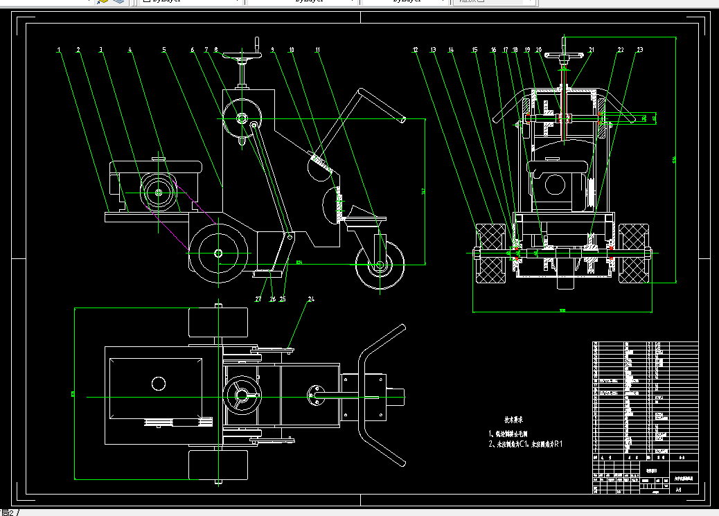 本次设计的是小型机动起草皮机,系统结构比较简单,结构尺寸也不大,要求能够实现对草皮的起草厚度进行灵活调节,按照我们的需求,能够改变起草的厚度的结构。本结构的结构采用的汽油机的动力装置,通过带传动带动割刀进行切割作业,并通过丝杆螺母来带动铲刀进行调节起草皮的厚度。随着城市的发展,绿化面积的大量需求,需要用到的草皮量非常的大,去草皮机的需求量非常大,所以在这种的形势下,设计出一个结构比较合理的自动去草皮机非常关键。本次的设计主要是对去草皮及的基本的结构设计,以及尺寸的详细计算,并利用AUOTOCAD软件对各部分的部件、总部件进行装配图的绘制,以及主要的零件进行绘制。并对主要零部件进行设计计算以及校核。
