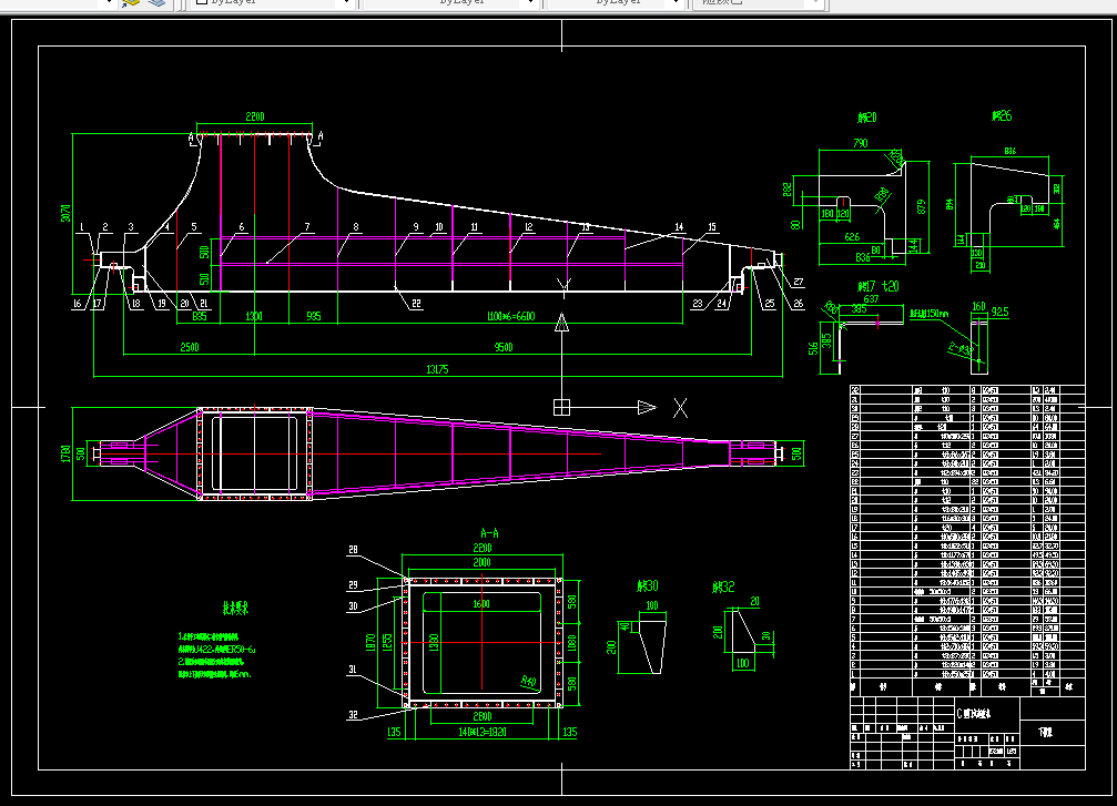 本设计采用许用应力法以及计算机辅助设计方法对C型单梁门式起重机桥架金属结构进行设计。设计过程先用估计的C型单梁门式起重机各结构尺寸数据对起重机的强度、疲劳强度、稳定性、刚度进行粗略的校核计算,待以上因素都达到材料的许用要求后,画出门架结构图。然后计算出主梁和端梁的自重载荷,再用此载荷进行门架强度和刚度的精确校核计算。若未通过,再重复上述步骤,直到通过。由于门架的初校是在草稿中列出,在设计说明书中不予记录,仅记载门架的精校过程。设计中参考了各种资料,运用各种途径, 努力利用各种条件来完成此次设计。本设计通过反复斟酌各种设计方案,认真讨论,不断反复校核,力求设计合理;通过采取计算机辅助设计方法以及参考前人的先进经验,力求有所创新;通过计算机辅助设计方法,绘图和设计计算都充分发挥计算机的强大辅助功能,力求设计高效。