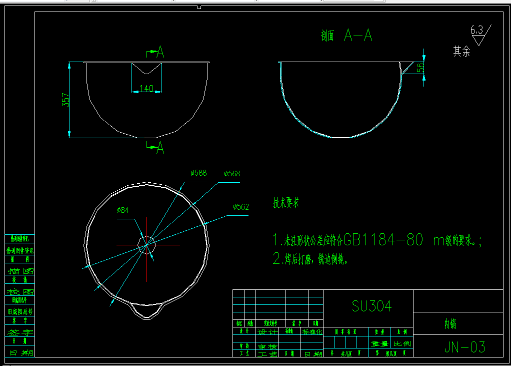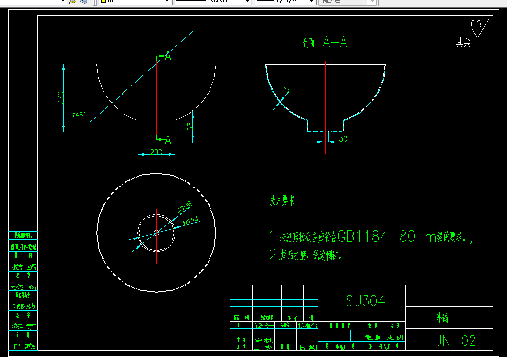 然后,通过对机械设计,机械制造技术基础课程的学习和实践,结合已经学过的材料力学,理论力学,工程材料课程的基础对夹层锅的各部件进行力学分析,强度校核,材料的选择以及加工工艺进行综合的分析和设计。最终完成夹层锅的整体设计。可倾式夹层锅锅体选用不锈钢SUS304L,SUS304相当于国内的0Cr18Ni9,常采用固溶处理。304相当于国内的0Cr18Ni9,在焊接后多用固溶处理,1100,快速冷却加热到1050,保温一段时间再快速水冷,现场一般不作固溶处理。硬度HB187,奥氏体基本钢种,用途最为广泛,耐腐蚀耐热性优良。