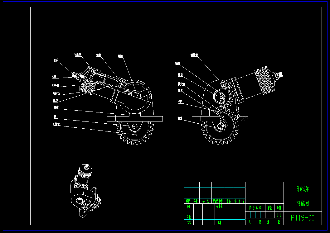 此空气压缩机供汽车轮胎充气只用。由汽车变速箱传来的动力使大齿轮等速回转,通过小齿轮、曲轴、连杆带动活塞上下往复运动;当活塞下行时i,活塞上部空间增加,形成负压,外界空气克服弹簧的压力后进气阀门自动打开,空气通过活塞顶部小孔,进到活塞上部,当活塞上行时进气阀门关闭,活塞上部气体被压缩,压强增加,钢球被顶开,于是气体便通过管路输送到汽车轮胎内。