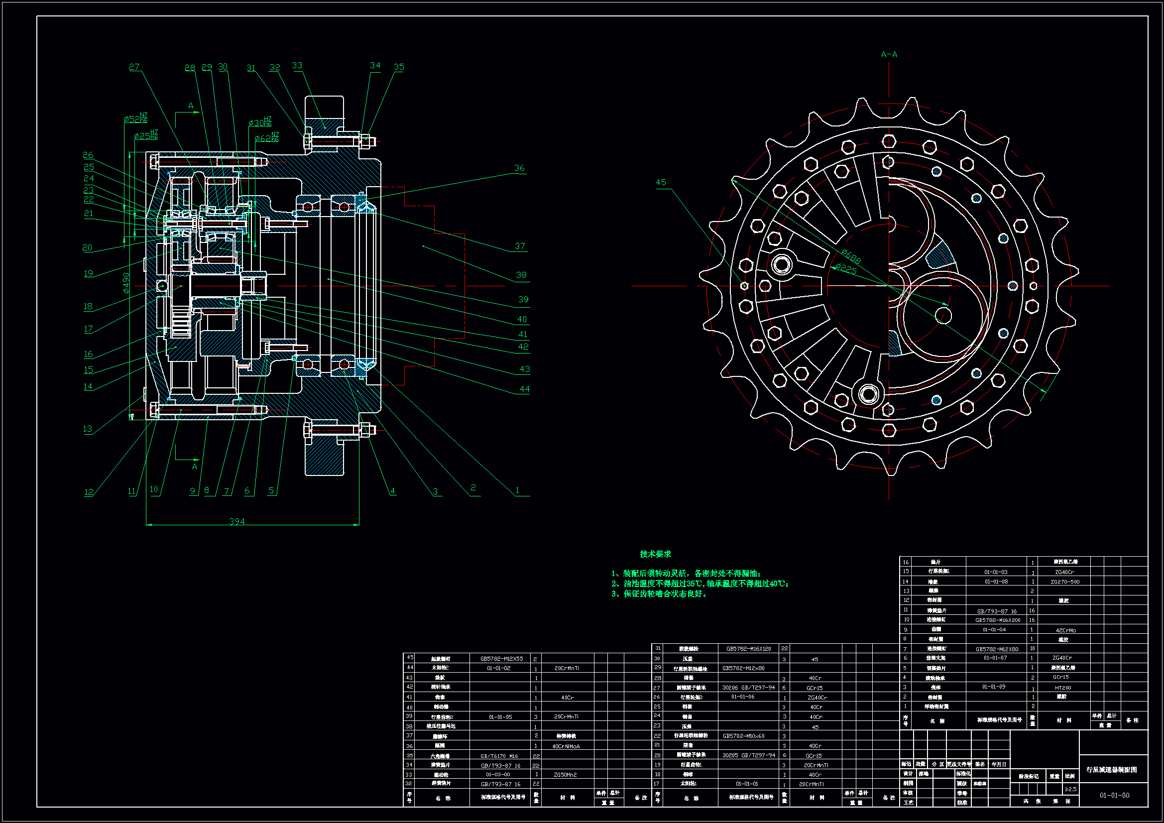本次设计的主要内容为:液压挖掘机底盘总体方案设计;绘制装配草图和总装配图;动力源选择及有关参数的确定;行走装置牵引力的计算;传动方式比较与选择、传动方案的确定及传动系统的技术设计;行星减速器及零、部件的设计计算,主要零件强度校核;张紧装置、行走架和四轮一带的选型设计;绘制零、部件图和总装配图,编写设计计算说明书。本设计的主要特点是:方案设计中提出多种方案,从可靠性、可实现性、综合性能等进行方案比较,选择方案。技术设计中应考虑总体配置合理、安全;选材、加工方法和技术条件可行;制图正确、标注齐全符合国家标准。充分注意整机各子系统之间的相关性,力求整机性能的一致性和最优化性。