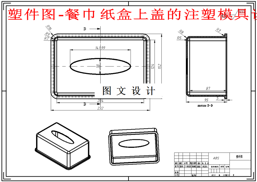 本文针对“餐巾纸盒上盖”注塑模具设计,首先选择并分析适合了这个塑件的高分子树脂材料,其次,分析了塑件的注塑成型工艺。结合塑件的实际结构特点与尺寸大小和精度要求。选择了合适的出模数量。针对整套模具的结构设计上面,本文采用了对应的成型系统来保证模具加工的可行性、浇注系统方面尽可能的贴合实际注塑生产工艺需求、冷却系统设计方面能够使得塑件的冷却更加均匀合理。根据GB国家标准,采用了龙记的标准模架系统,同时采用了其他的模具标准件,使得设计和制造更加的简单。