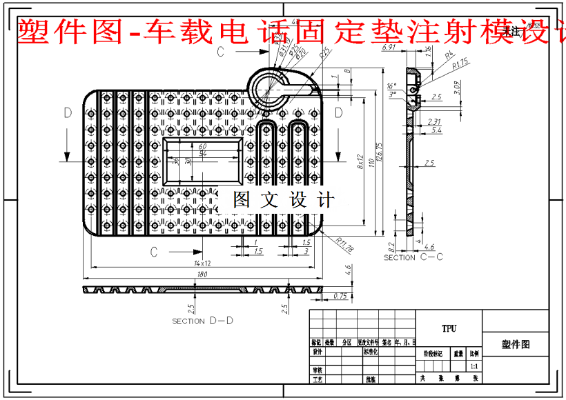 本次设计是以“车载固定垫”塑件为原始文件,进行注塑模具设计。首选针对此塑件,进行结构分析,确定其塑件结构适合采用注塑模具结构生产,然后选择合适的高分子材料与型腔的出模数量。结合模具设计原则与设计规范,选择分型面并且分模完成成型系统零件设计,对浇注系统的设计方面,力求充填均匀,流道废料少、短。冷却系统均匀的分布在塑件的周边,使得温度冷却合理,在脱模顶出机构上,采用均匀分布顶出系统,让塑件能够均匀的受力顶出脱模。在选择标注模架系统方面,采用了国内最大的模具企业生产的龙记GB国标标准模架系统,能够保证制造周期短,制造精度高、效率高的特点。本次设计是以“车载固定垫”塑件为原始文件,进行注塑模具设计。首选针对此塑件,进行结构分析,确定其塑件结构适合采用注塑模具结构生产,然后选择合适的高分子材料与型腔的出模数量。结合模具设计原则与设计规范,选择分型面并且分模完成成型系统零件设计,对浇注系统的设计方面,力求充填均匀,流道废料少、短。冷却系统均匀的分布在塑件的周边,使得温度冷却合理,在脱模顶出机构上,采用均匀分布顶出系统,让塑件能够均匀的受力顶出脱模。在选择标注模架系统方面,采用了国内最大的模具企业生产的龙记GB国标标准模架系统,能够保证制造周期短,制造精度高、效率高的特点。