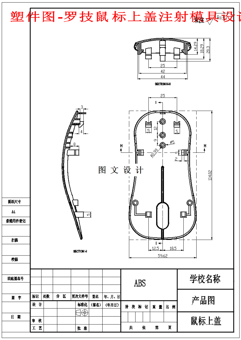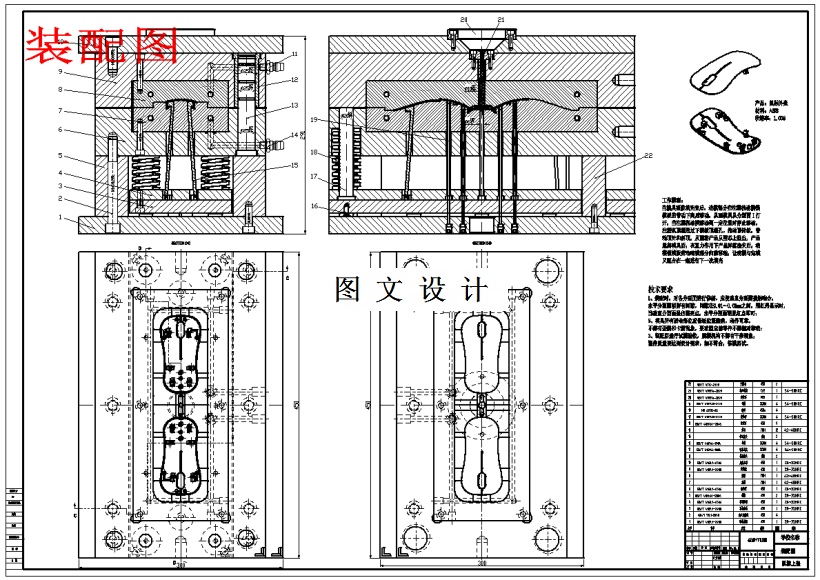 本课题针对一个塑料制成的鼠标上盖,通过三维软件3D,对鼠标上盖进行模型的绘制,同时对模具的成型零件进行设计,并绘制出相关的零件图纸文档。设计过程中,模具选择一模二腔的结构,采用潜伏式浇口以及环绕式冷却的方法,对产品进行注塑。本课题设计的模具具有良好的工作稳定性,结构比较紧凑,注塑过程比较平稳,而且冷却的效率也比较高,可以减轻工人的劳动强度,提高生产效率,降低生产成本,最重要可以保证产品的精度。除模具结构设计外,本文针对模具的布局确定、型腔与型芯、浇注系统、冷却系统等部件进行了详细的设计。