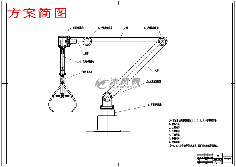 关于本次课题研究的整体流程,首先是对机械手的运行原理和整体结构进行研究;其次是对应规划了设计方案所采用的六自由度关节型结构;最重要的一步是对主要零部件进行完整设计以及完成校核;随后,对于各个结构所需具体数据参数进行计算以及校核;最后的步骤是通过AutoCAD制图软件来绘制总体装配图和其余具体的零件图。