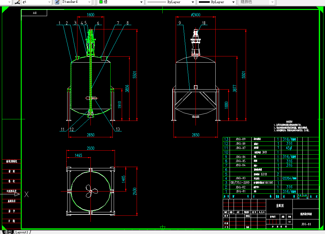 本课题主要介绍了搅拌器在化工工业中的应用,研究现状以及发展趋势;通过对罐体设定为筒体式以及搅拌介质确定为丙烯酸和醋酸,夹套介质为水蒸气,来设计并选用推进式搅拌器。其中包括了对搅拌功率的计算;附件的选取;搅拌器的结构设计;搅拌器强度计算及其校核;搅拌轴与搅拌器的连接;电机、机架、联轴器等一系列传动装置的选择;以及计算筒体封头厚度与稳定性校核;筒体开孔及补强。根据所设计的搅拌器绘制出相应的装配图以及零件图。最后,在对自己所设计的进行总结。