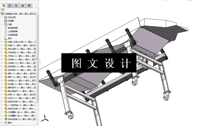 论文重点研究了红枣的智能化分拣机,其中的振荡机构可以让红枣更好地在筛网中移动,从而确保了机器的工作效率,而筛网的结构则可以很好地控制红枣的分类直径。此外,还对红枣在筛网中的移动和受力展开了研究,从而使得该设计可以与实际情况相吻合,同时还对一些辅助结构展开了设计,比如对支架和导轨的进行了设计,并对其进行了计算,来确保整体的机械结构可以达到需要的程度。在红枣向前移动的过程中,那些比筛孔直径更小的红枣会在引力的影响下,进入到分选槽中,在第一段冲程中,那些直径小于2 cm的红枣会穿过筛网,进入一级分选槽,再经过第一个出料口进行装袋;在第二次冲程中,直径为2~3公分的大枣经筛子进入二级分选槽;最后在筛网中大于3公分的红枣会从第三个出料口中直接掉落,再装袋。该机构是利用低速电机与 V带直接相连,然后由 V带带动偏心轴,并利用偏心轴连杆将动力传递给分类机构,从而完成对红枣的分类。