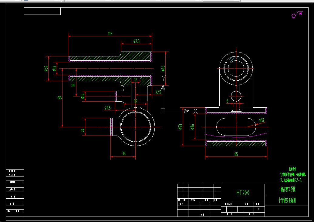 本次设计的主要内容是十字接头加工工艺规程及 孔车孔夹具的设计。十字接头主要是与其它零件配对使用,其主要加工表面及控制位置为 内孔和 内孔。由零件要求分析可知,保证 孔和 孔的精度尺寸的同时应该尽量保证其平行度,这对于后工序装配和总成使用上来说都有重要影响。所以,工序安排时,采取以 内孔粗定位夹紧加工后,对 孔进行车削加工同时成型。因其粗糙度为Ra6.3,可通过粗车、精车满足。对于钻2-M10螺孔时,主要以十字接头的四个侧面定位,控制其自由度,以达到加工出来的产品满足要求并且一致性好的目的。本文的研究重点在于通过对十字接头的工艺性和力学性能分析,对加工工艺进行合理分析,选择确定合理的毛坯、加工方式、设计高效、省力的夹具,通过实践验证,最终加工出合格的十字接头零件。