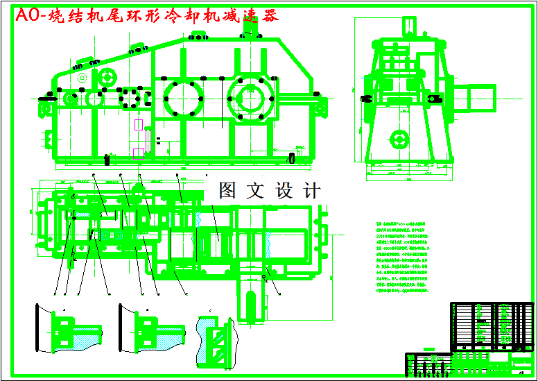 本设计对各种类型的减速机进行了综述,并详细分析了燃结机尾环形冷却机减速器的工作原理和结构特点。本设计首先对燃结机尾环形冷却机减速器进行总体结构的功能性设计,并系统分析了各部分之间的运动关系,绘制了系统的传动链示意图,对一些典型零件进行受力分析及强度校核。本次设计了一种减速器,采用的是四级齿轮传动,能够保证实现起减速器各机构实践需求的速度,为整个工序的有效有序生产提供了技术保证。