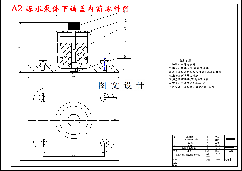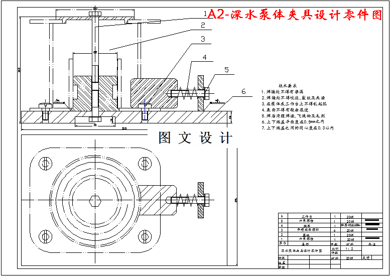 深井泵将地下水抽取到地面后经输水管道送到地面上,广泛用于农业灌溉、畜牧业牲畜饮水以及人们的生活用水,本次泵体采用奥氏体不锈钢(1Cr18Ni9Ti)材料经氩弧焊焊接而成,由于地下水中富含氢离子、氯离子、盐类物质以及溶解于水中的O2、H2S等因素置换铁,使铁离子溶于水中,从而使深井泵体受到腐蚀。此外焊接时深井泵易产生焊接残余变形和上下端板位置的相对移动。为保证深井泵的尺寸精度、不发生角变形,本次设计了下端盖与内筒、上端盖与外筒、外筒与下端盖,出水口、以及总装配五套夹具,同时在选择焊条直径时充分考虑了减小焊接热输入,选择焊接电流时,当其他参数不变,原则是在保证焊接质量的前提下,焊接电流越小越好。由此保证了深井泵的焊接工艺要求。